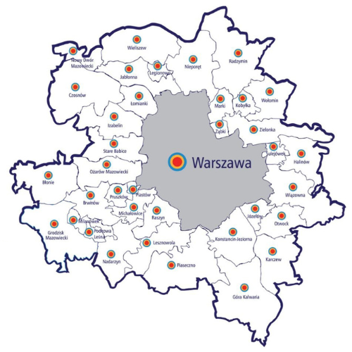 ,Marki,Kobyłka,Wołomin,Ząbki, Zielonka, Stare Babice, Sulejówek, Halinów, Błonie, Ożarów Mazowiecki, Wiązowna, Brwinów, Pruszków, Piastów, Grodzisk Mazowiecki, Milanówek, Michałowice, Raszyn, Józefów, Otwock, Nadarzyn, Lesznowola, Piaseczno, Konstancin Jeziorna, Karczew, Góra Kalwari.